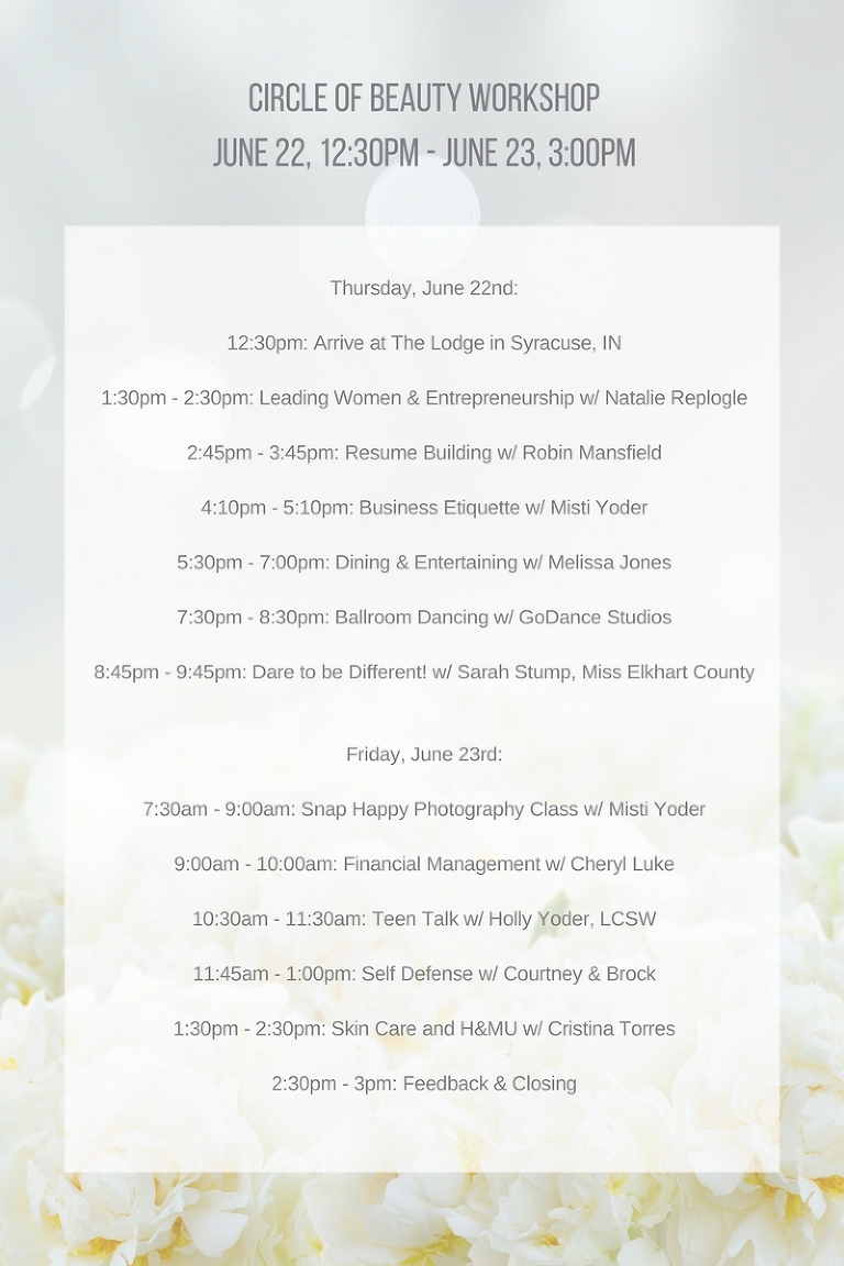 I’m so excited to be hosting the Circle of Beauty Workshop again this year.  We once again have an awesome line up of speakers that have graciously volunteered their time and expertise.  We do have limited space, so don’t wait to sign up. You don’t want to miss this opportunity. This is an overnight event and we are super excited to be hosting it at the beautiful Lodge in Syracuse.
