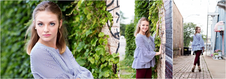 Grace wanted to be sure to incorporate her kitten. So cute.  Downtown Elkhart provided a nice backdrop for this fashionista who loves checking out the latest couture collections and going to the big city (she spent part of her summer at an art studio in Chicago). Don’t you love how the wall matches her gorgeous eyes?  And considering that pink is Grace’s fav color, we couldn’t pass up the door for a photo-op.